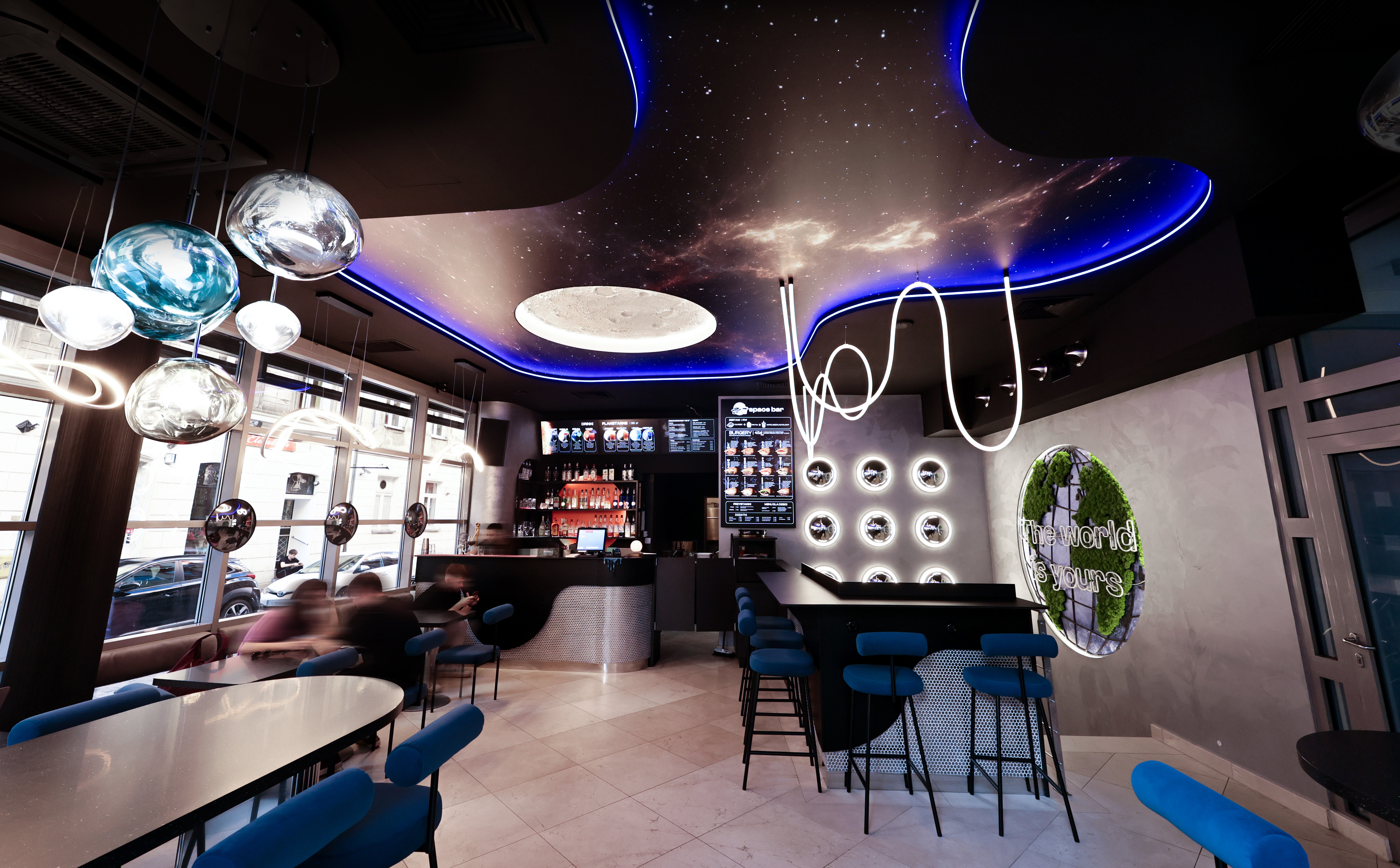 W Space Bar lądujecie prosto w kosmosie smaku – food sharing na środku stołu, kosmiczne koktajle nazwane planetami i klimat, który bardziej przypomina najlepszy wieczór w mieście niż sztywny bankiet.